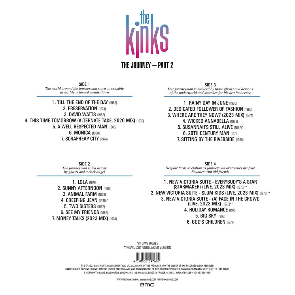 To add to the magic of The Journey Part 2, this release features beautifully crafted liner notes by the band themselves. They delve into the band's remarkable journey, shedding light on the creative process, memorable anecdotes, and the enduring legacy of The Kinks offering you a glimpse into the band's world, providing context and insight into the stories behind these timeless classics.