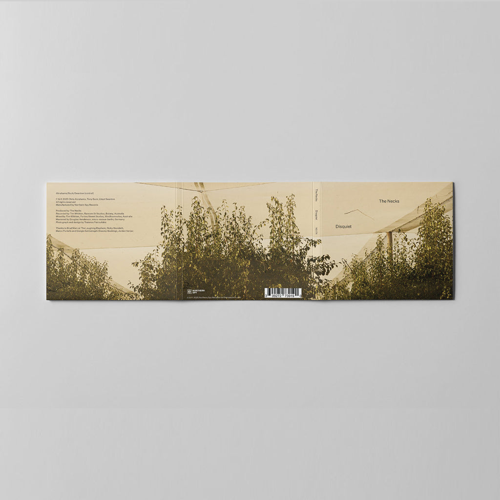 The music of The Necks has always carried a profound sense of shared responsibility –– between the players, of course, in their utter commitment to the improvisational –– but also between the work and its audience. With music so open, there are profound opportunities to choose: what to focus on, whether to focus at all, etc. Disquiet takes this further: there is no particular listening order prescribed. There is no “Disc 1, Disc 2, Disc 3.” The music itself seems to stretch time, and this presentation challenges ideas of sequencing. The Necks, one may argue, are a mode of discovery as much as they are a band. Regarding the sound itself, The Necks’ signature restraint and textural depth remain, with subtle tonal shifts, evolving motifs, and roiling phases of keen and propulsive clatter, strains of subdued surprise and unmatched intentionality –– as ever, expansive and absorbing.