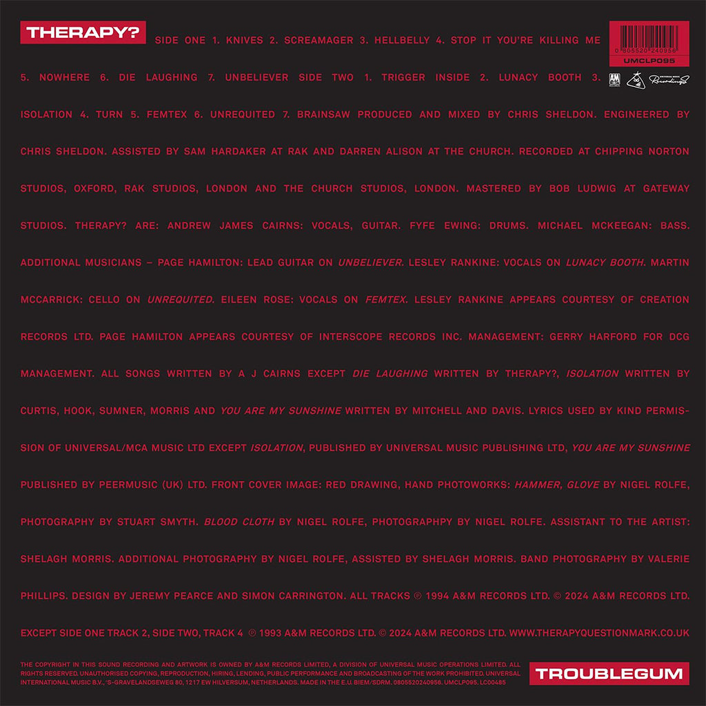 By the time Therapy? released Troublegum in 1994 they were already well established, but it was the first time many had encountered the group's intensely melodic blend of hard rock and indie, an arresting combination of old and new, striking in its immediacy