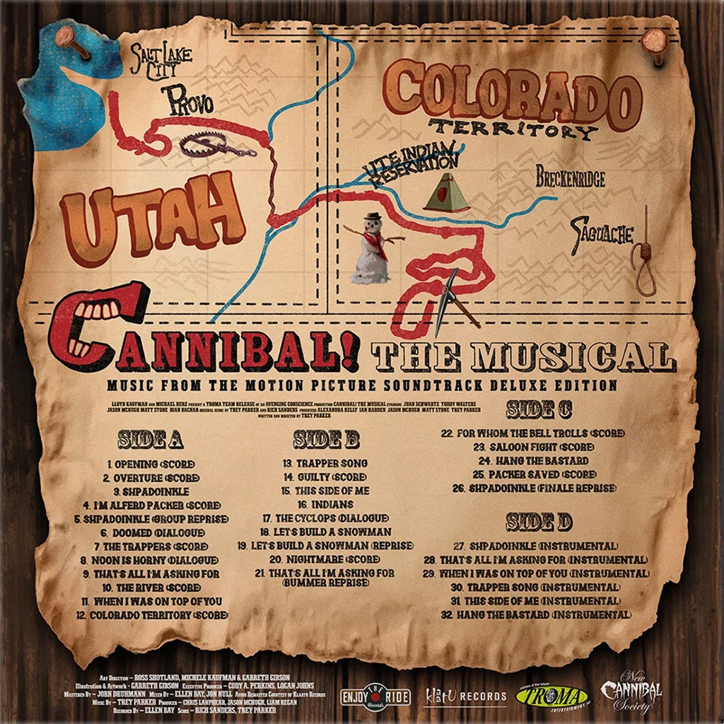 Enjoy The Ride Records, in partnership with New Cannibal Society, proudly presents the 2xLP Expanded Deluxe Vinyl release to the Cult-Classic Horror/Comedy Cannibal! The Musical, directed by Trey Parker, co-creator of South Park and The Book of Mormon. The film stars Trey Parker (South Park), Matt Stone (South Park), Dian Bachar (Baseketball, Orgazmo), Jason McHugh (Orgazmo) and Toddy Walters (Orgazmo).