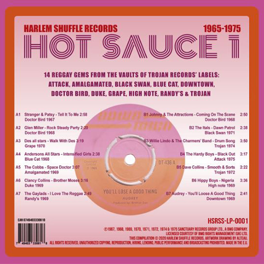 This is the first volume of the Hot Sauce compilation LPs dedicated to the Trojan related UK labels between 1965 and 1975. It features Rocksteady, Boss Reggae, early Dub and early Reggae, outstanding original Jamaican tracks including rare songs, overlooked gems, hidden treasures and some hits. The record labels showcased on the first volume are Attack, Amalgamated, Black Swan, Blue Cat, Downtown, Doctor Bird, Duke, Grape, High Note, Randy’s and Trojan.