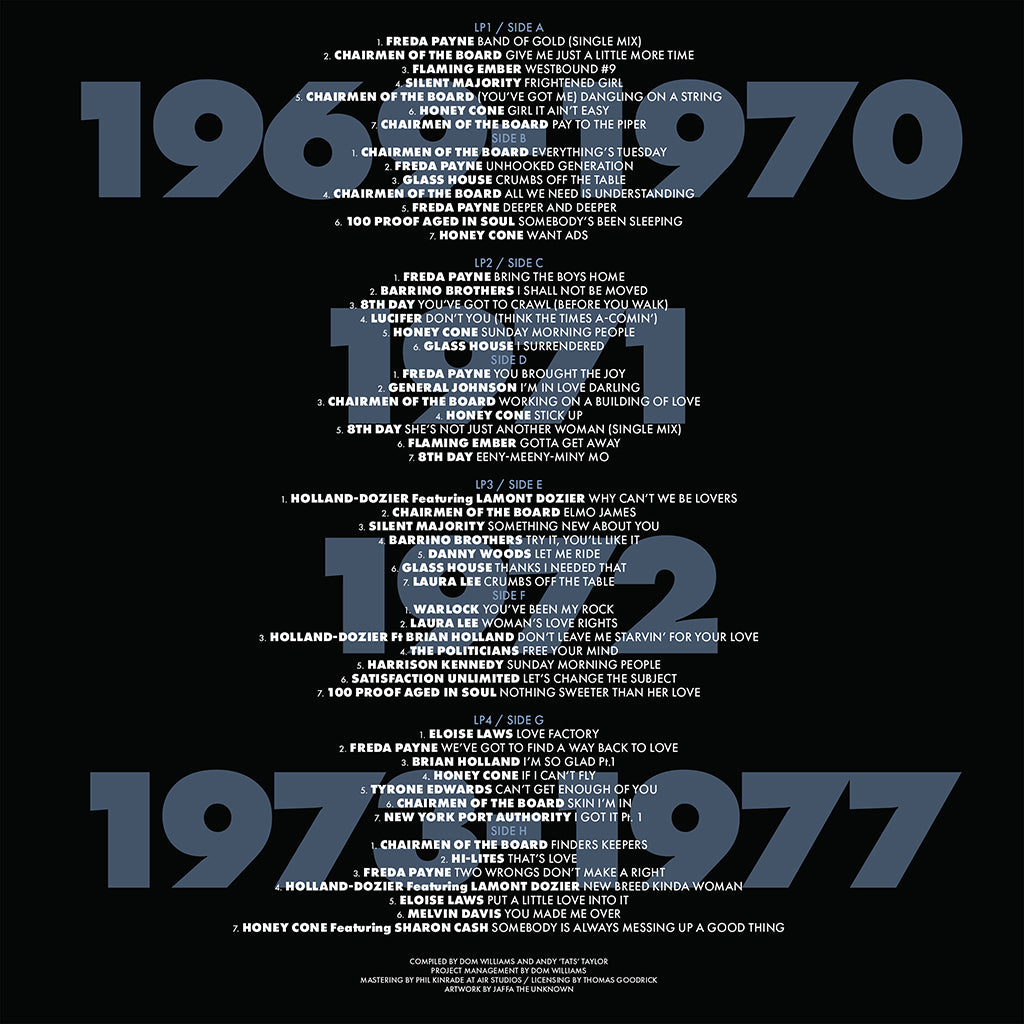 This compilation is a definitive look at this period in history , exploring how H D H, under a new guise ‘The Creative Corporation’, drove the next generation of soul music in a myriad of different ways, towards funk, underground disco and jazz . Featuring 55 tracks, this collection documents HDH’s creativity and growth over this seminal 8 year period. During this time the trio developed new artists to rival Motown’s success such as Chairman Of The Board, Freda Payne, Honey Cone, Glass House, Flaming Ember, 8th Day, Laura Lee & Eloise Laws.