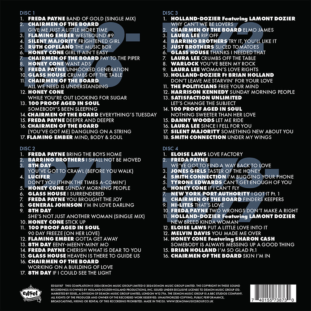 This compilation is a definitive look at this period in history , exploring how H D H, under a new guise ‘The Creative Corporation’, drove the next generation of soul music in a myriad of different ways, towards funk, underground disco and jazz . Featuring 68 tracks, this collection documents HDH’s creativity and growth over this seminal 8 year period. During this time the trio developed new artists to rival Motown’s success such as Chairman Of The Board, Freda Payne, Honey Cone, Glass House, Flaming Ember, 8th Day, Laura Lee & Eloise Laws.