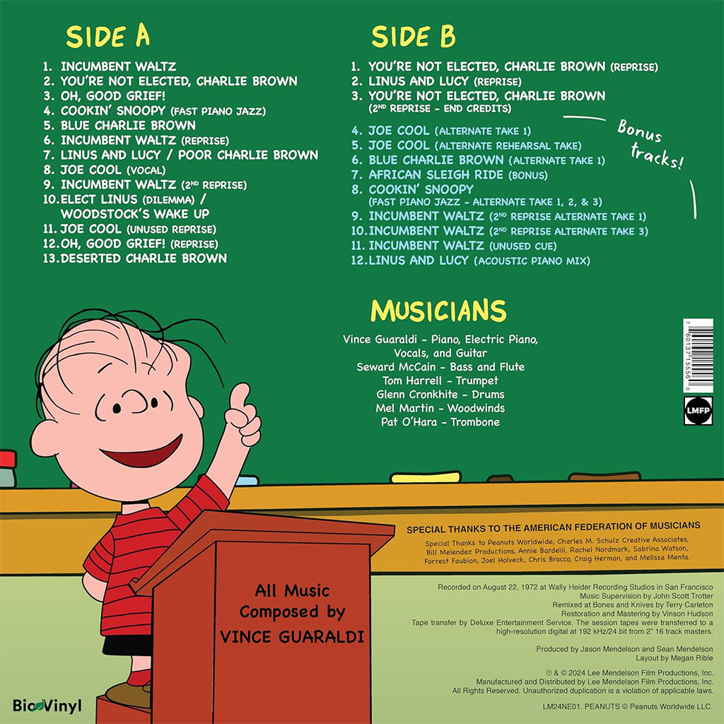 Newly re-discovered in our vaults, the original recording sessions for Vince Guaraldi's soundtrack for "You're Not Elected, Charlie Brown" now remastered for audiophiles and Peanuts fans and election lovers everywhere. All versions of this release include the original 15 tracks of cues from the special - with extended performances available for the first time ever - plus 10 extra bonus tracks never before heard since their recording in 1972.