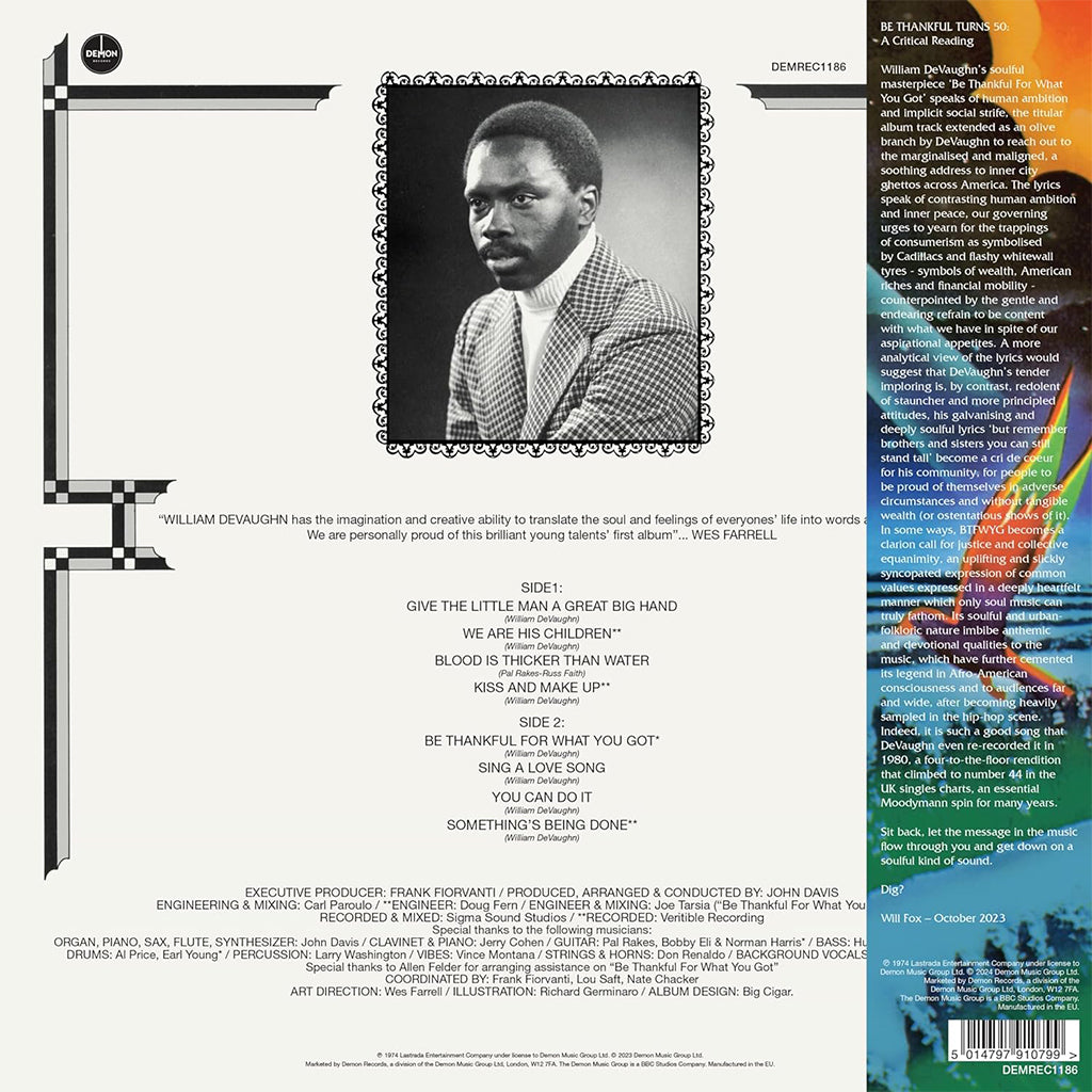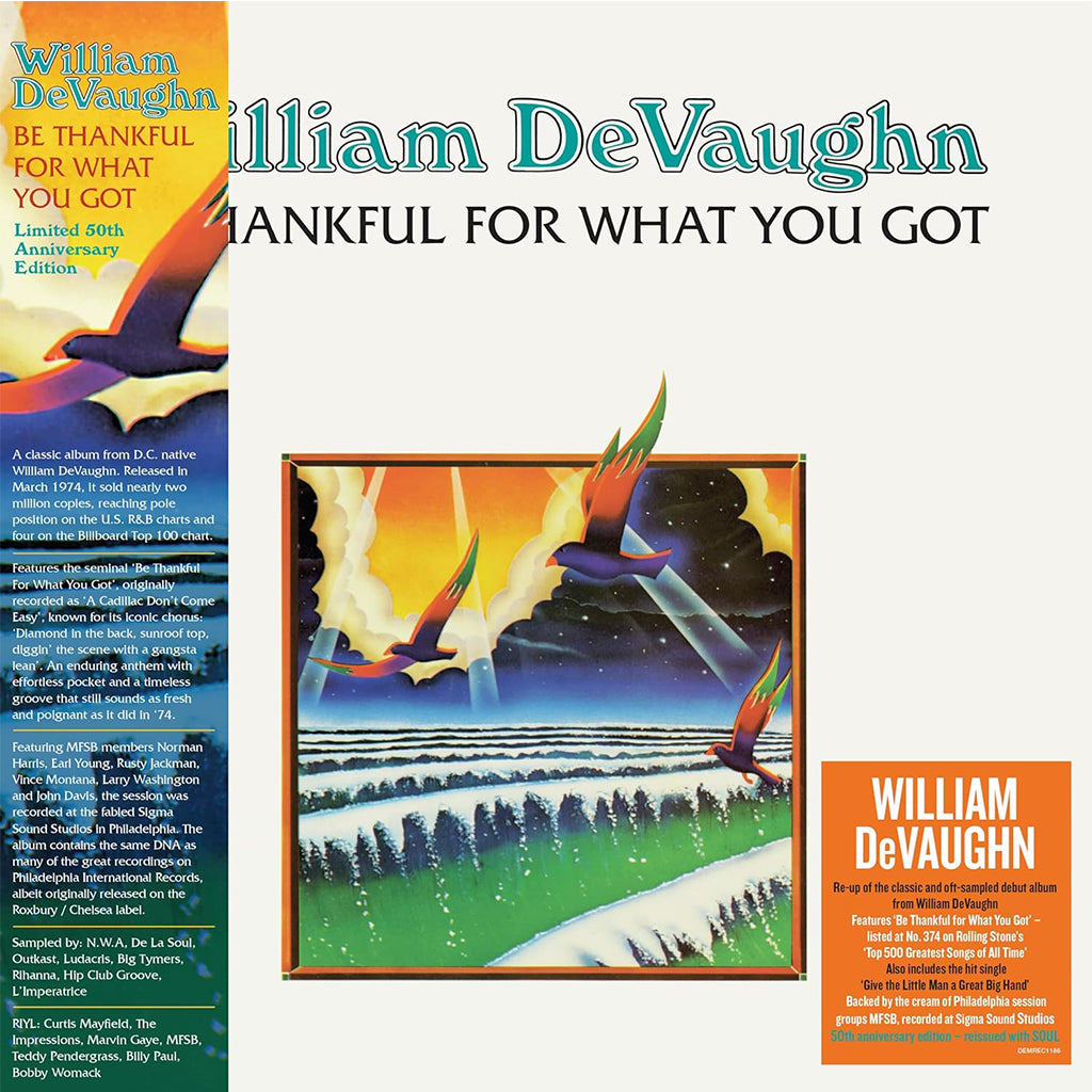 Released in March ’74, sold almost 2 million copies, reached the tip of the U.S. R&B charts and four on the Billboard Top 100 chart. Features the seminal ‘Be Thankful For What You’ve Got’ (Diamond in the back, sunroof top, diggin’ the scene with a gangster lean.) as sampled by N.W.A, De La Soul, Outkast, Ludacris, Big Tymers, Rihanna, Hip Club Groove and L’Imperatrice. Backed by the cream of Philadelphia session groups MFSB (Norman Harris, Vince Montana, John Davis). Re-reissued per popular demand, with newly mastered audio, and an obi strip containing fresh insights on Devaughn and his music.